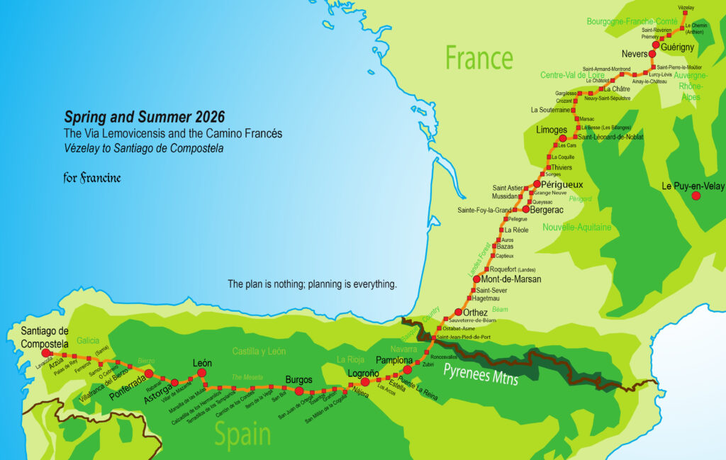 At the annual Gathering of Pilgrims back in 2022, Francine attended a talk on one of the four main Camino routes in France: the Voie de Vézelay, also known as the Via Lemovicensis. She was immediately smitten with this route. For one thing, it passes through the city of Nevers in France, which is where Saint Bernadette is entombed. Bernadette was Francine’s confirmation Saint.