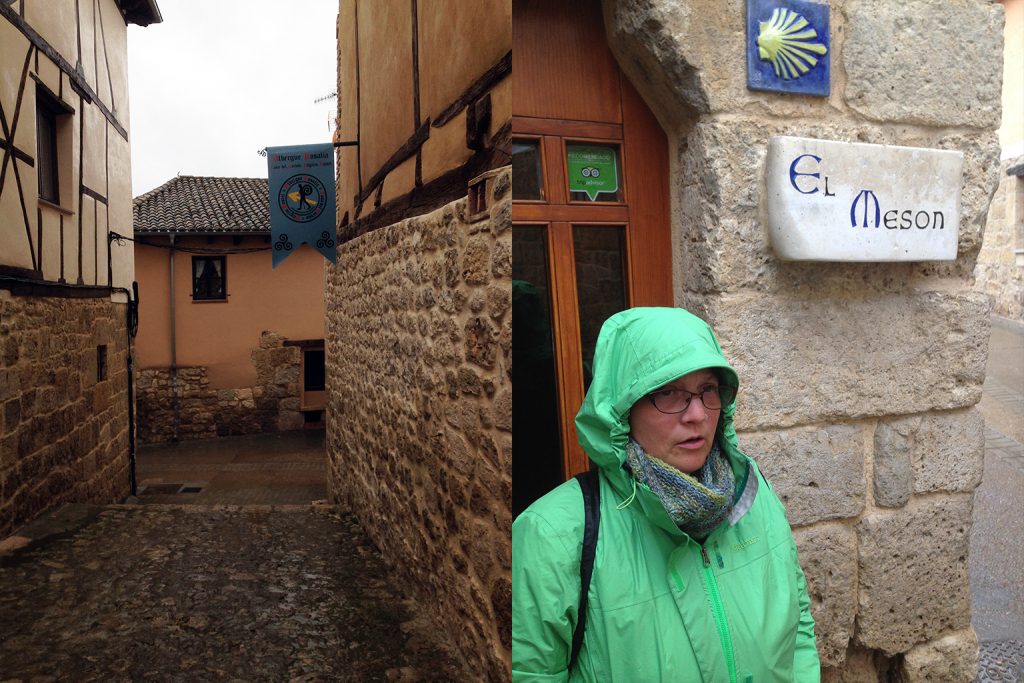 A rare composite photo that sums up our evening in Castrojeriz. On the left is our albergue, the wonderfully comfortable and brand-spanking-new Albergue Rosalia. The proprietors are young and enthusiastic, and the entire place was built into several older connected buildings and designed with homey comfort in mind. They preserved the old exposed wooden beams and quirkily uneven walls and floors, but all of the furnishings and appointments are new. I recommend this place without reservation. Speaking of no reservations, we had dinner in a local place “El Meson” just down the block from the albergue. It was crowded. Although we’ve seen a clear increase in the number of pilgrims over the last days, only a handful ate here while we were there.