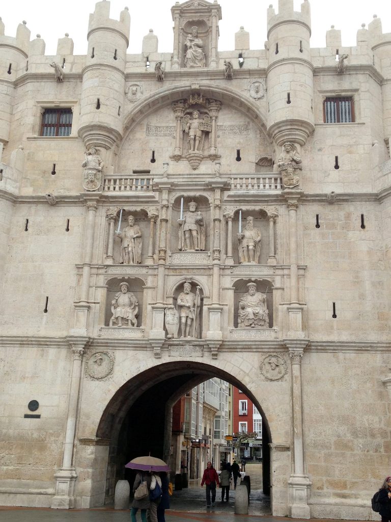 Through this gate, we enter the city centre of Burgos, once the capital of the Kingdom of Castilla. Obviously, the gate has had some renovations since medieval times – those statues look 15th century or so. At the very top, we of course have Madonna and Child, and then below that an angel holding a model of the city. The bearded fellow in the centre below that is Charlemagne.