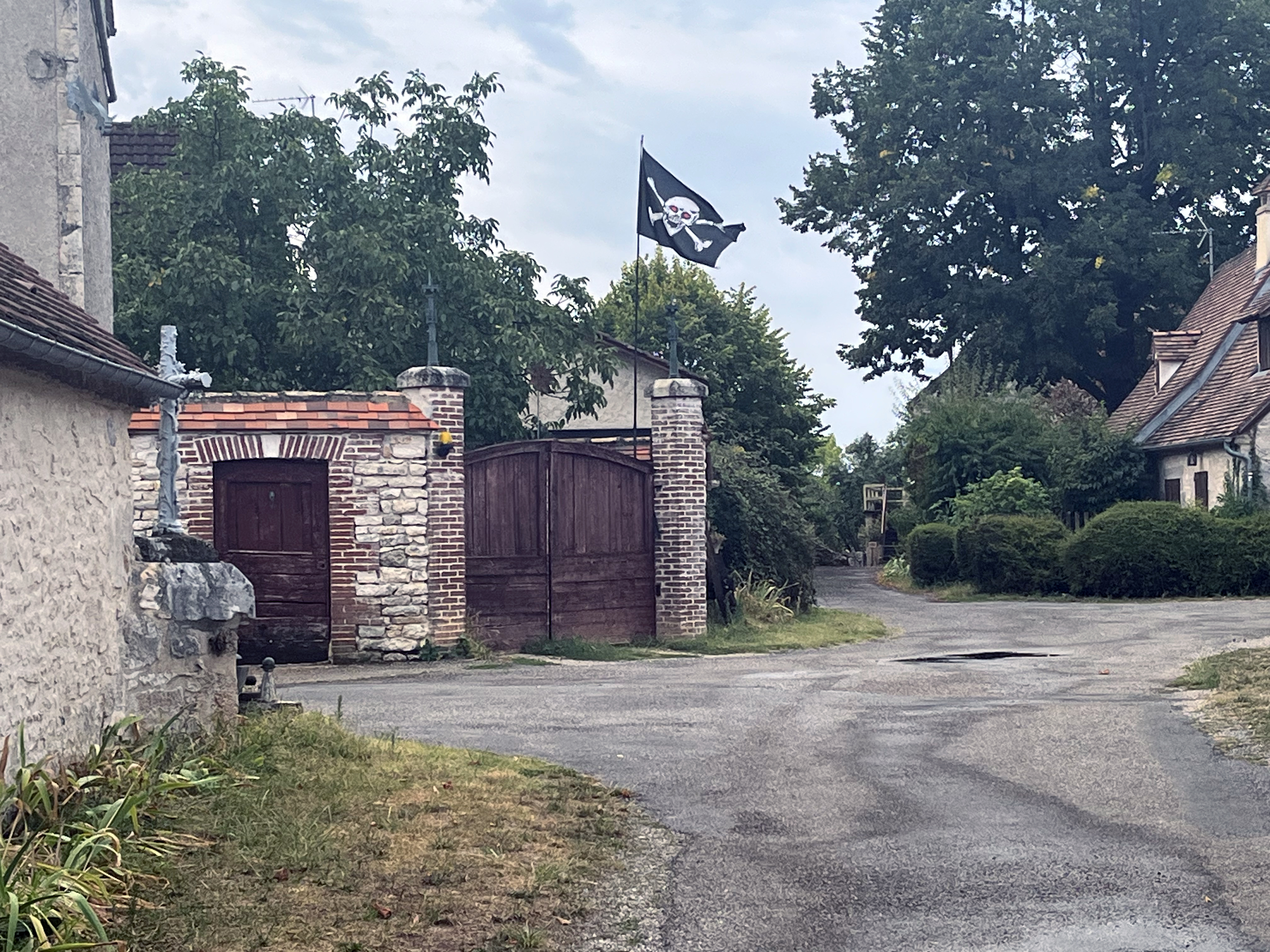After getting myself un-lost, I wandered into the little village of Couzou. I was looking for somewhere to refill my nearly empty water bottles. I decided not to stop here. Call me crazy, but the flag dissuaded me. Fortunately, there was a village water pump in the little yard outside the church. More on that tomorrow, perhaps.
