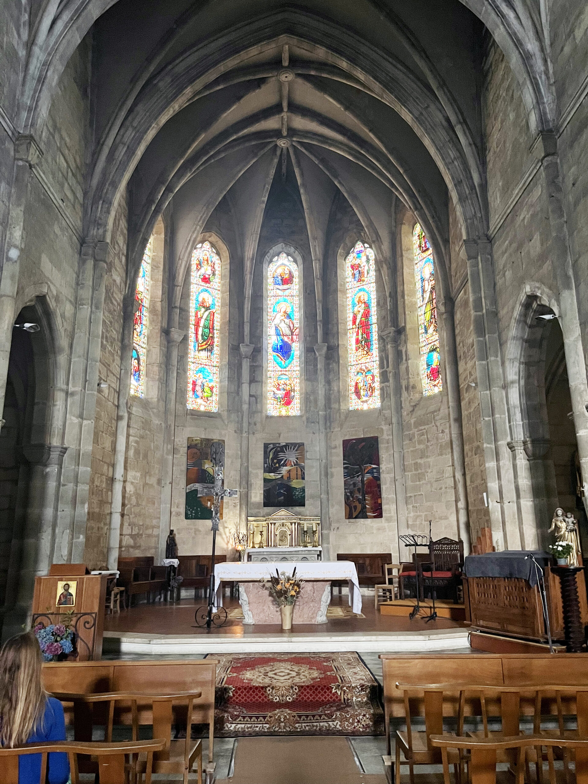 Next we stopped in the Church of the Assumption in Lacapelle-Marival. This little Gothic jewel only dates to 1575, when it was built on the site of an earlier Romanesque chapel, dating probably to the 12th century. The church was extensively remodelled in the 19th century. I think the stained glass dates from that time. Just as I was finishing Vespers, a Mass broke out. More on that tomorrow.