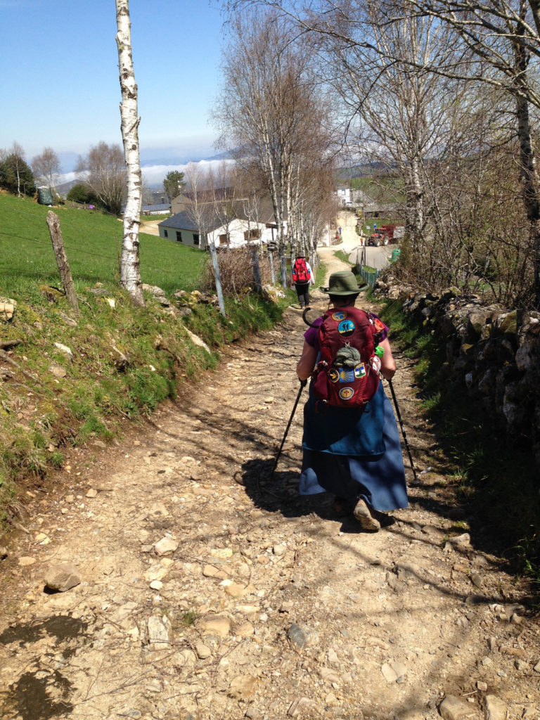 Our stalwart troop marches in to Biduedo – or possibly Viduedo, reports vary. We’re looking forward to lunch, and walking with purpose and resolve. This is a good shot of the patches on Francine’s pack. Not sure why we like patches so much. Maybe it’s memories of Boy Scout patches on uniforms and vests.