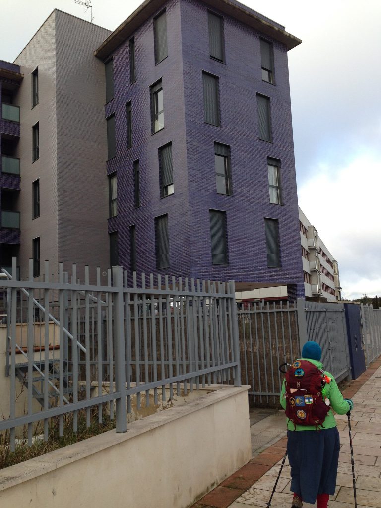 We continued our urban slog out of Burgos. I often say that a kilometer on concrete is worth two kilometers walking anything else. As we got farther and farther from the old medieval center, Burgos became more and more modern. I cordially dislike modern architecture, but at least this building was an interesting colour. We managed to get our breakfast in a trendy sort of diner/coffee shop mostly populated by urban commuters.