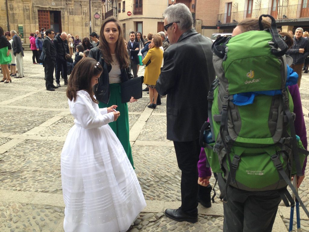 Pilgrims and parishioners mix in the Cathedral square in Santo Domingo de la Calzada. We are but passing through, but for many of these young Catholics, they are passing through the sacrament of Confirmation and joining the Church Militant – that portion of the communion of saints still walking upon the earth. And no doubt some of them will take a moment of that walk in future years to join us on the Camino. For we are all but pilgrims upon the earth, walking towards our heavenly homeland.
