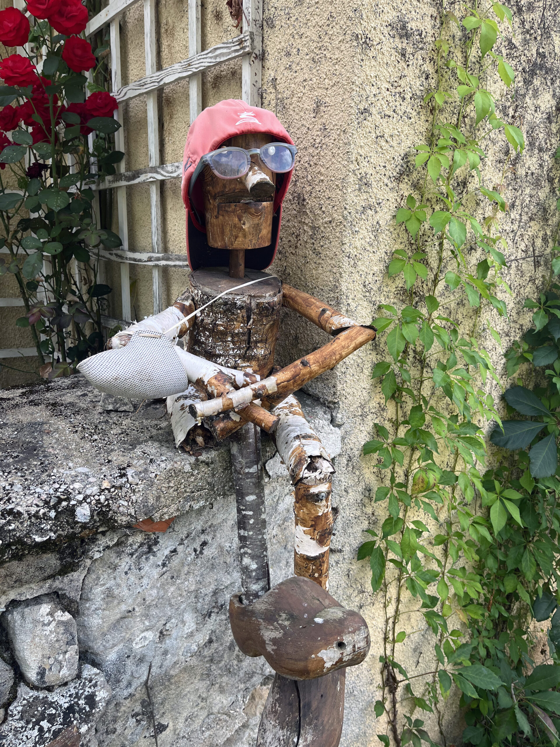 We passed this fellow sitting on a wall next to a house several kilometers before Lacapelle-Marival. He appears to be constructed mostly of logs and sticks, perhaps firewood. He very much reminded me of the whimsical art I saw in the village of Estaing, five days before.