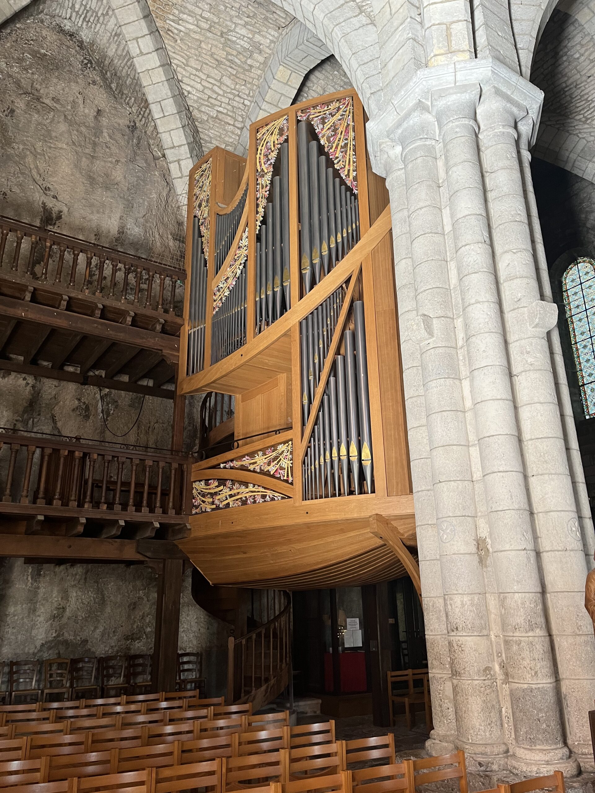 I mentioned yesterday that the organ in the Basilica of the Holy Saviour in Rocamadour is shaped like a ship. Well, here it is. You can see the wooden hull under the pipes, and the designs in the frame are meant to suggest sails. I can almost see it if I squint. You can also see that the back wall of the basilica is just the cliff face.