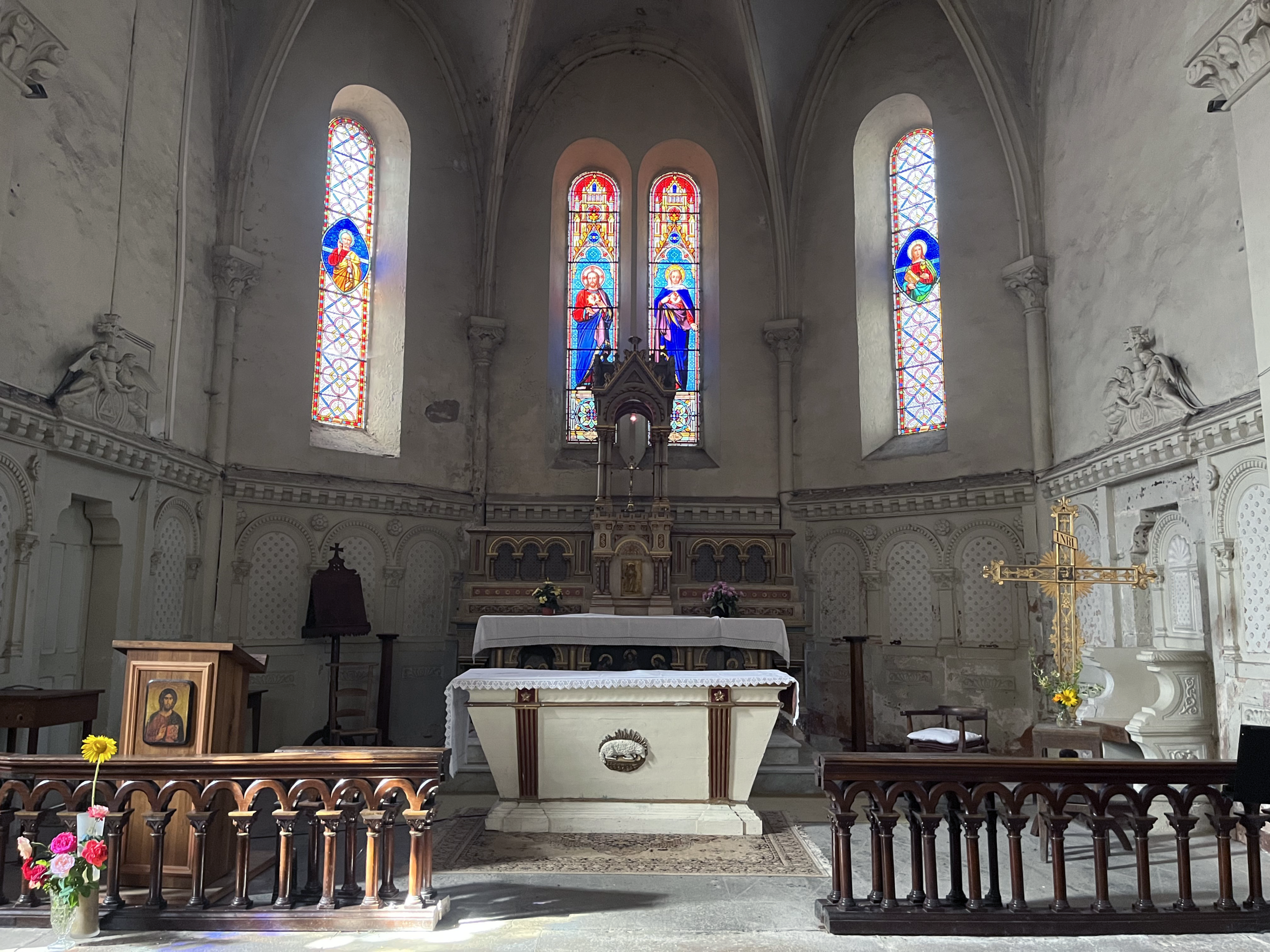After Bruno and Anne left, I eventually checked into my gîte, which proved to be charming and lovely. Then I found the local church to pray Vespers. It turned out to be an absolutely luminous place. I prayed with a statue of Saint Joan of Arc – one of Francine’s favourite saints – at my elbow.