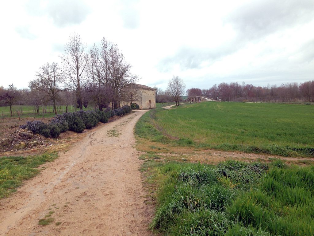 We are approaching the Ermita de San Nicolás de Puente Fitero. This little 12th-century church once belonged to the Knights of the Order of the Hospital of St. John of Jerusalem (a.k.a. the Knights of Malta). For awhile, it was a parish church for the nearby village of Itero del Castillo. Nowadays, it’s an albergue run by the Italian Confraternity of Saint James, open from late April through October. Had it been open when we passed it, we might have called it a day.