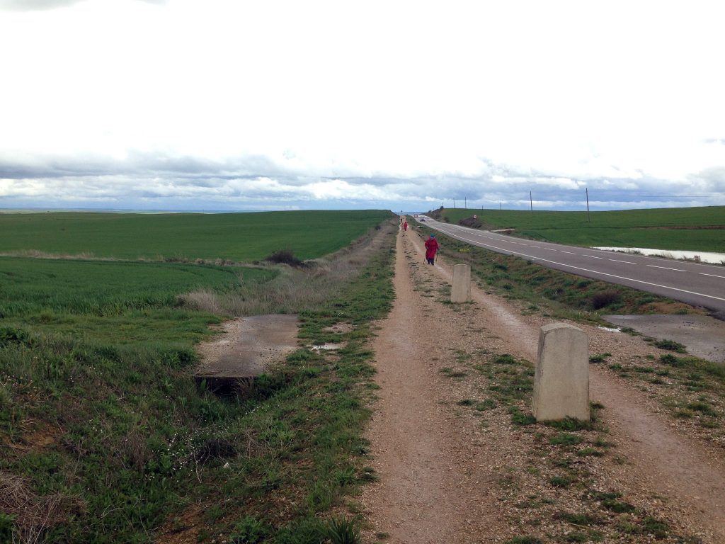 The Meseta is generally quite flat. The section between Villalcázar de Sirga and Carrión de los Condes is particularly flat and featureless. This was the section in my first Camino where I walked for over an hour without seeing another human being from horizon to horizon. The Camino was a little more crowded this time, as you can see. I wonder if it has more to do with increasing numbers of pilgrims or with the weather bunching us up?