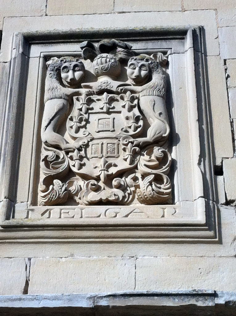 And we’re back! These arms are found on the side of an imposing, if rather plain, stone building in the hill town of Sansol. They are the arms of the Melgar family, and the building has the rather grand name of Palacio Melgar. Although it’s made of the same red sandstone one finds all over Navarra, for some reason in the photo it appears much greyer than in person. No, I don’t know why the emblems in the middle appear to depict telephone poles.