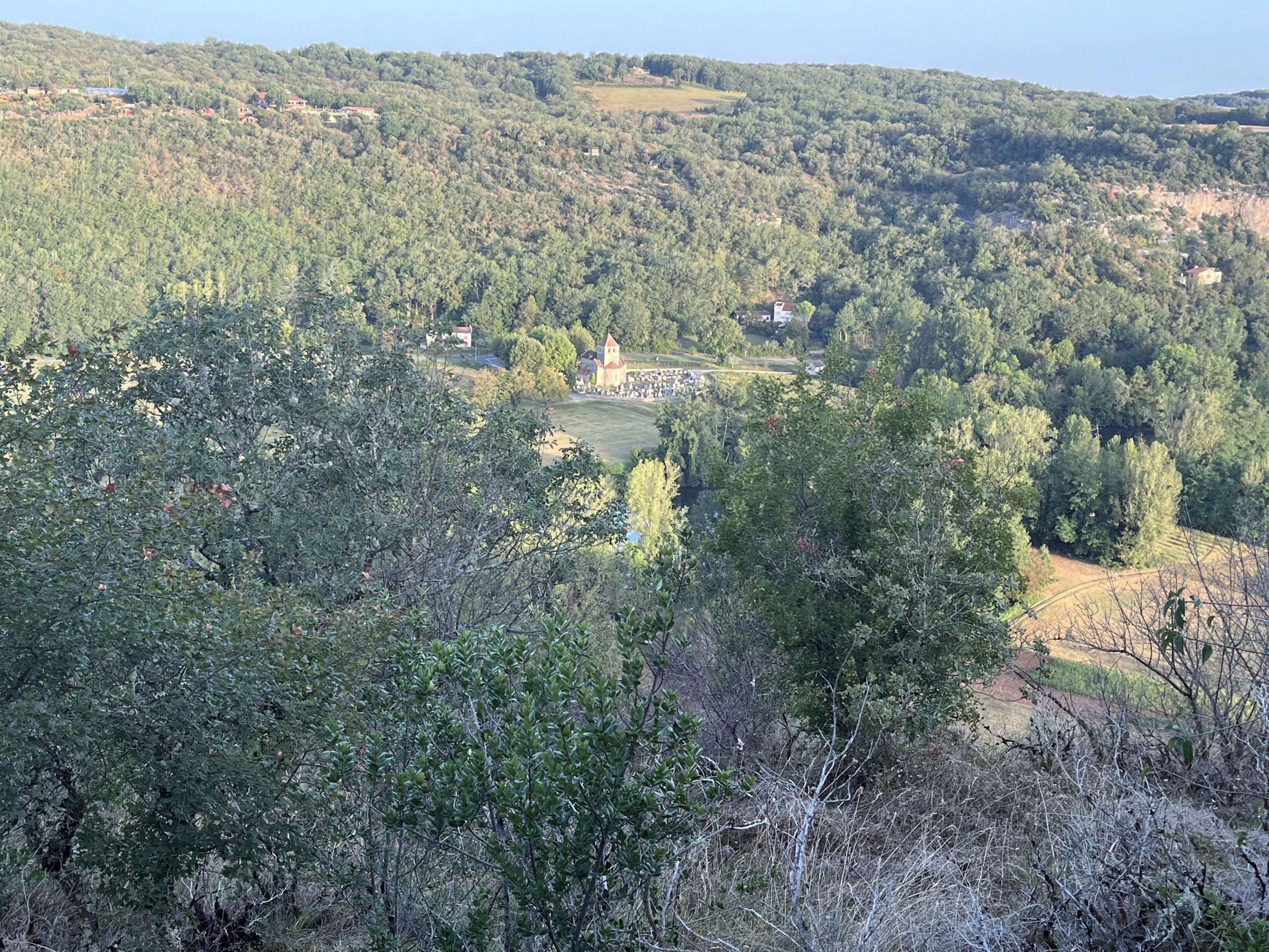 The Way climbed high above the river. From the vantage point near the top, I could see farms and gardens spreading out from the banks, so it appears this rough route was designed to avoid the farmers’ property. I was already dripping with sweat, and the forest was warm and humid. It was only when I came to a bit of a clearing that I realized that my path was at the same altitude as the tops of the cliffs that I had seen yesterday.