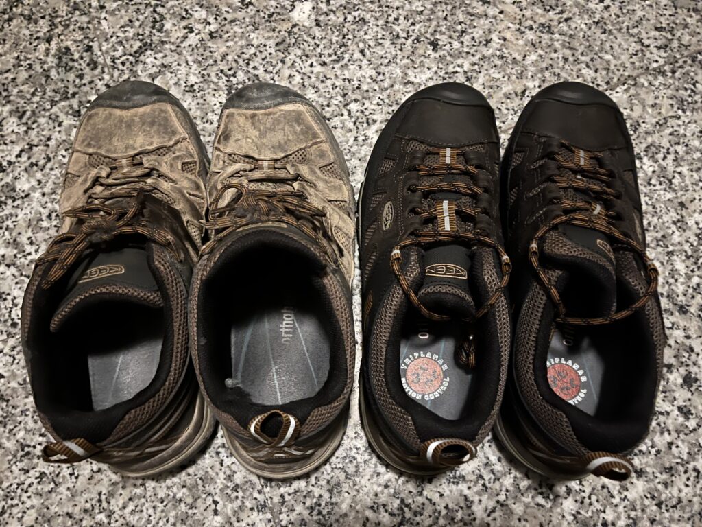 One pair of shoes will not be enough. When I walked in 2023, I had to change out my shoes after about 900 km. Francine served in Logroño before I was due to arrive, and she just left me a second pair of shoes. The photo shows both pairs of shoes, the same brand and style, on the day I swapped them.